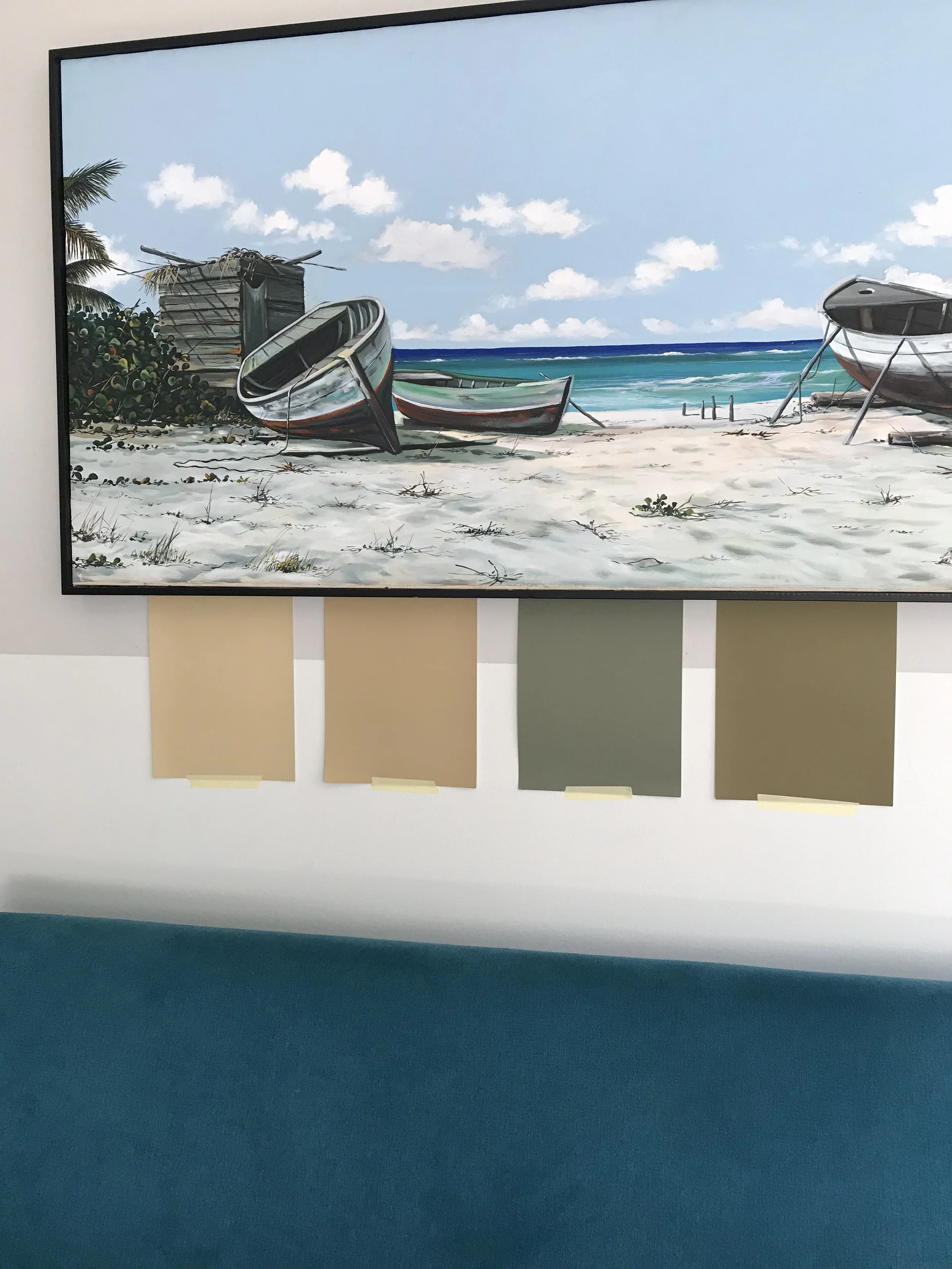 In de fotobewerking met de blauwtinten zie je hetzelfde aanzicht waarbij het plafond wel en niet is mee geschilderd. Op deze manier kun je ook goed bekijken hoe de twee blauw kleuren samen werken en tot waar welke kleur mag doorlopen. Dit project is in 2022 gerealiseerd en zover ik weet zitten beide kleuren nog op de wanden :)