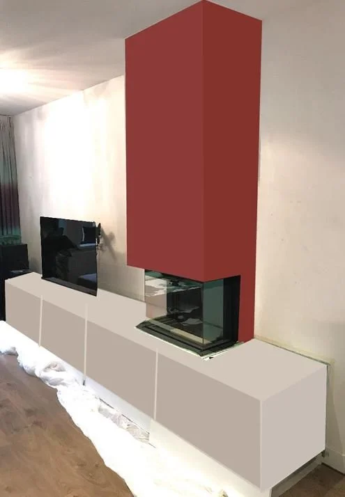 Elk project en bewoner is anders, daarom zullen we tijdens onze brainstorm bespreken of je extra’s nodig hebt en hoe dit eruit zal zien. Soms zijn het foto’s waar ik kleurvlakken overheen leg, maar het kan ook een abstractie weergave van de rode schouw zoals hierboven.