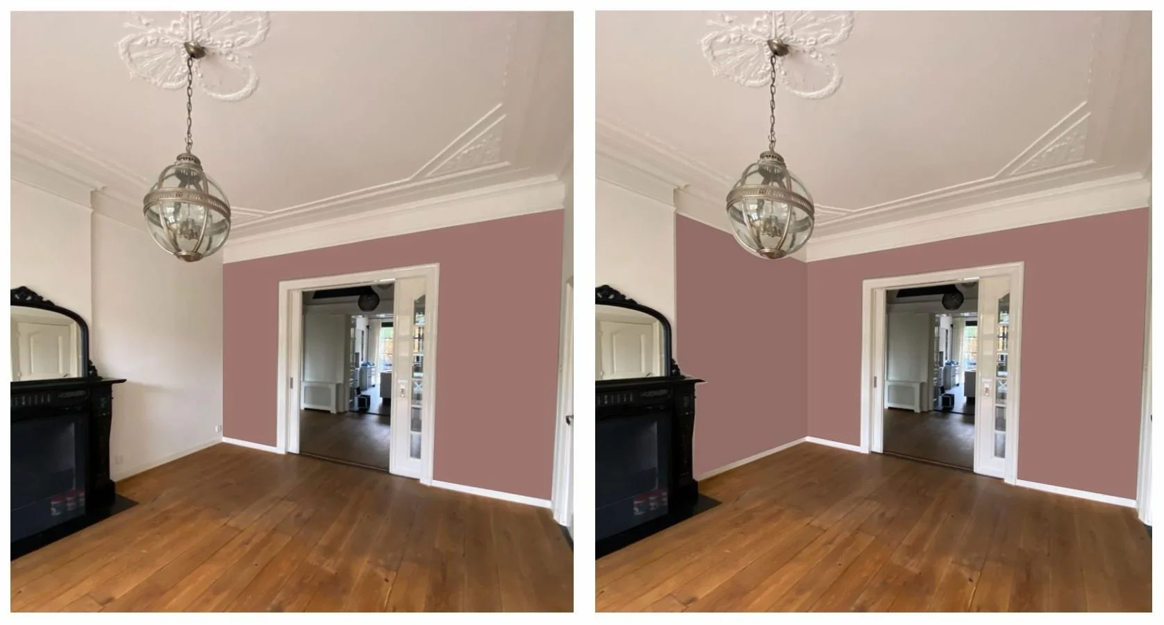 Hiernaast zie je een aanzicht waarbij het plafond wel en niet is mee geschilderd en het uiteindelijke resultaat.